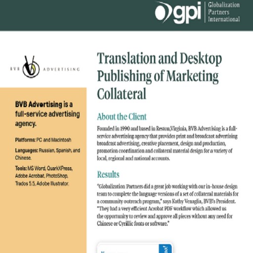 Globalization Partners International provided Russian, Spanish and Chinese document translation and multilingual desktop publishing services to BVB, a D.C.-based advertising firm. The project involved several marketing collateral pieces, including 8-panel brochures and posters. GPI worked with BVB’s design team to ensure the language versions maintained the same design and branding as the English pieces.