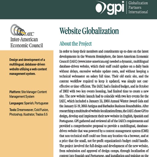 In order to keep their members and constituents up-to-date on the latest developments in the Western Hemisphere, the Inter-American Economic Council (IAEC) needed website translation to develop a dynamic, multilingual database-driven website their staff could update on a daily basis without delays, excessive website update costs, and without keeping a technical webmaster on salary full time. Their old static site, and the content workflow required to keep it updated, was simply not cost-effective or time-efficient. The IAEC had a limited budget, and in October of 2002 with two key events looming, had limited time to create a new site. The new website launch had to coincide with two key events for the IAEC which included a January 23, 2003 Annual Winter Award Gala and the Antigua and Barbados Business Roundtables on January 15-19, 2003.