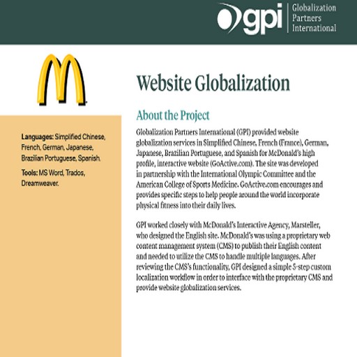 GPI provided website globalization services in Simplified Chinese, French (France), German, Japanese, Brazilian Portuguese, and Spanish for McDonald’s high profile, interactive website (GoActive.com). The site was developed in partnership with the International Olympic Committee and the American College of Sports Medicine. GoActive.com encourages and provides specific steps to help people around the world incorporate physical fitness into their daily lives.