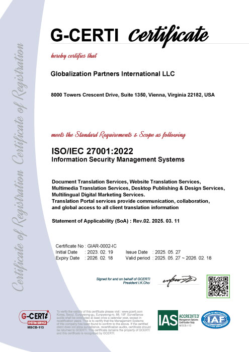 GPI is an ISO/IEC 27001:2013 certified Translation Service Provider (TSP) and has passed all requirements for the core policies,