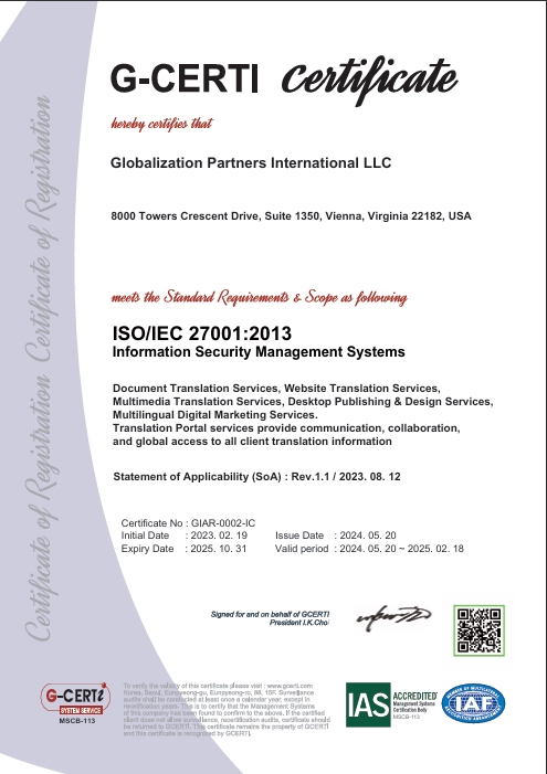Сертификат соответствия стандарту ISO/IEC 27001:2013 в области менеджмента информационной безопасности стал вторым сертификатом ISO, полученным компанией GPI, а положения стандарта интегрированы в платформу Globalization Project Management Suite® (GPMS) и портал Translation Portal. Принципы информационной безопасности внедрены в наши процессы, информационные системы и средства контроля. Методы управления данными в соответствии со стандартом ISO 27001 и сертификация по ISO/IEC 27001:2013 защищают GPI и наших клиентов от деловых и юридических рисков.