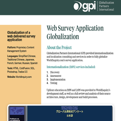 Globalization Partners International provided globalization consulting in order to fully internationalize and localize WorldInquiry.com’s survey application.