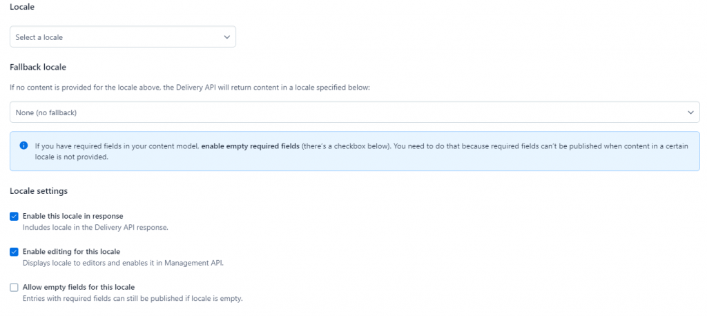 Additionally, you can specify a fallback locale (if there is no content in the given locale), it will show the content in the locale selected as a fallback. For example, if you are adding Spanish (Spain) as the locale and you select English (US) as the fallback, then, if there is no content for a given item in Spanish, Contentful will return the English (US) content.