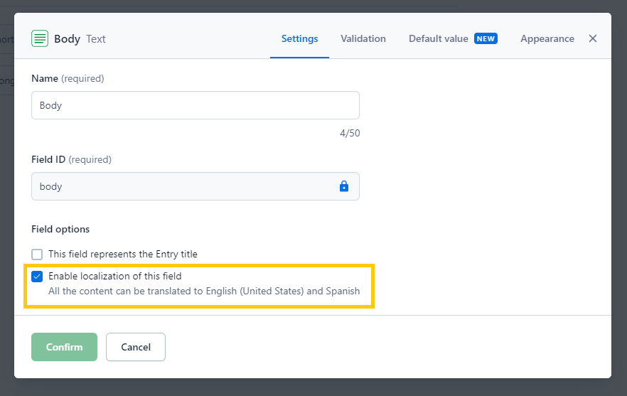 In this popup, you can check the option Enable localization of this field. This option, when checked, will allow you to translate the value on any entry of the given content type containing this field. This setting is not checked by default, so make sure to review all the content types and the fields are enabled for localization as expected, before starting any localization project.