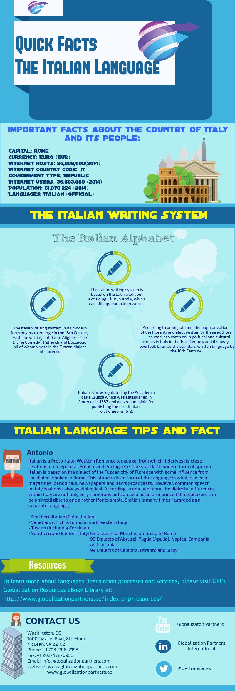 To provide you with a snapshot of the information found in GPI’s latest eBook below is a summary infographic.Ā You may also download the full eBook at Quick Facts: The Italian Language