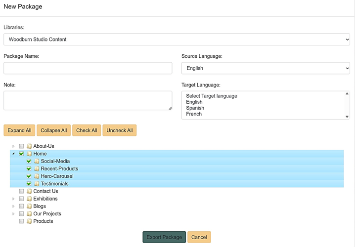 Granular export allows you to choose a specific item from HCL DX and send it for translation, with the option to include its children. This method provides flexibility for translating specific content. This can be accomplished through creating a customized package and enabling users to make granular selections of items within the selected base library. This flexibility ensures that your translation needs are met precisely.