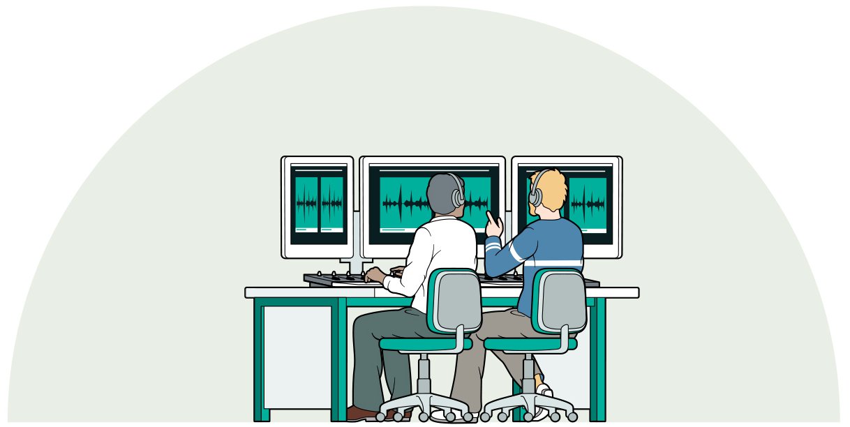 Ljudteknikern, rösttalangerna och röstcoacherna arbetar tillsammans för att spela in manuset.